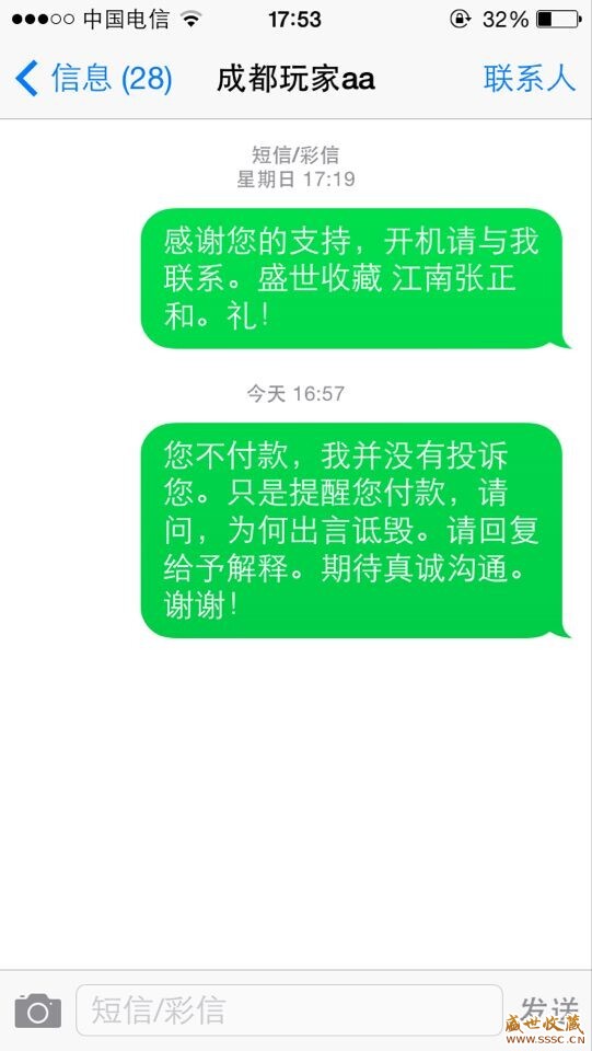 對話:成都玩家aa 信譽:1 搜索帖子 詳細資料 大 中 小 提示:若對方用各種理由推托使用中介交易或將您引入站外交易,請謹慎對待謹防受騙。X <上一頁. @4 v M4 h# ?" ?' W 成都玩家aa 于 2015-01-09 15:49:36 刪 轉發(fā) 你好,和田玉保真嗎?。我多拍幾個。順豐包郵可以嗎。我成都的。& J6 G- H% T; l; q 我 于 2015-01-09 20:32:07 刪 轉發(fā)( p8 k# |, L; O" Y; c0 F1 q" d 都保證是和田籽料。 所有拍品- F: u w1 ^* ]( {9 X* y7 m 五星分級服務: (第一星):買前溝通,無欺無詐。 3 H Z$ z& X) H) _ c 買前友好協(xié)商,不欺詐,不隱瞞,給買家提供一切便利。2 y, O: Z0 v0 u( i (第二星):中介交易,必走盛世。 交易通過盛世拍賣中介平臺,保障買賣雙方享受最滿意的服務。 (第三星):七天退貨,真無理由。 ! ~3 |& C% y8 S$ f; L. m 七天無條件包退(沒有任何條件,即使物品損壞也要妥善解決)。 (第四星):禮品包裝,快遞順豐。 7 W+ A% B7 V6 {0 C# e! y 快遞只選順豐快遞或者EMS。包裝精美,以買家可以直接送禮為宜。 (第五星):退貨費用,賣家全包。 賣家承擔退貨環(huán)節(jié)所有費用,不讓買家損失一分錢。5 l& j" m& R% S% S% n4 P0 E8 P 我 于 2015-01-09 20:33:47 刪 轉發(fā)" e; c! O- K: z1 Q1 w 我們在盛世論壇首倡并一直執(zhí)行的五星服務。# {1 I/ ?+ Y* \( Q 我 于 2015-01-10 17:57:31 刪 轉發(fā) 您好,感謝您的支持,1 H' q4 b) ~* \3 x/ ^1 y9 Q 剛才打您電話,顯示關機狀態(tài)。 希望跟您在交割問題上溝通一下。7 T( C( X( V' T" m# q u4 a 我的手機號是,189********.靜候您的佳音。 G' e* c1 D# f8 x; b3 } 我 于 2015-01-13 15:16:16 刪 轉發(fā) 您好,我們的拍品如果三天之內(nèi)不聯(lián)系確認交割,公司會要求取消交易, 請您看到短信,及時與我取得聯(lián)系。 萬分感激。3 T3 [/ u/ K7 W 以后還請多多支持,多多指教。 江南張正和,禮! 我 于 2015-01-14 21:31:53 刪 轉發(fā) 因為無法與您取得聯(lián)系, 我們在此通知您,我們將取消交易。 如果您看到此短信,或者有什么需要我們?yōu)槟峁┓眨?br /> 請電話聯(lián)系" U- H+ y6 I/ U+ k$ Q% V 189******+ }2 C. @# z q$ b+ L 江南張正和。, n# c8 [1 z+ I7 w0 \2 l 禮!. R0 |# |9 }) x! O; ~( s7 a }: J 0 X! B- t& k6 A& ? 我 于 2015-01-16 17:38:53 刪 轉發(fā)* S( J G0 m( W9 q1 n2 P ?不知何故? 出言騷擾, 期待真誠溝通。。。" ?" ~6 h5 J3 V) e" m: |( l 下一頁> |